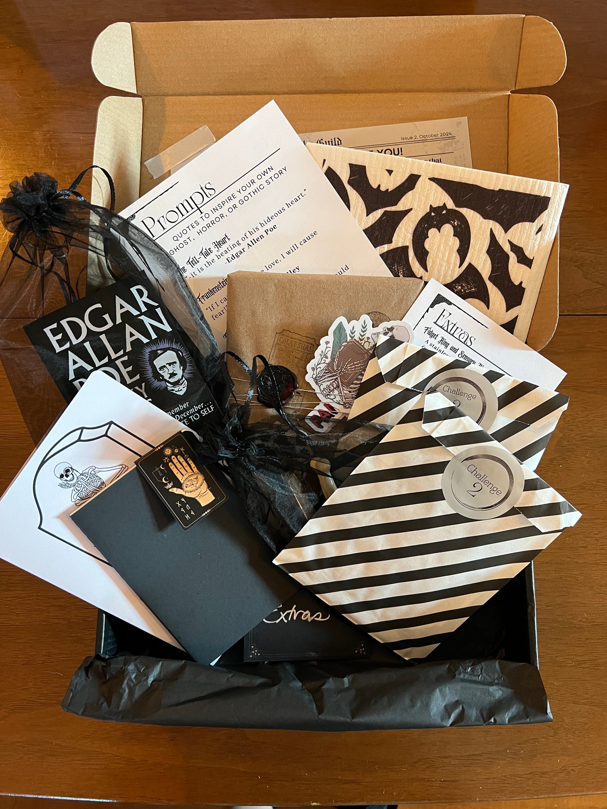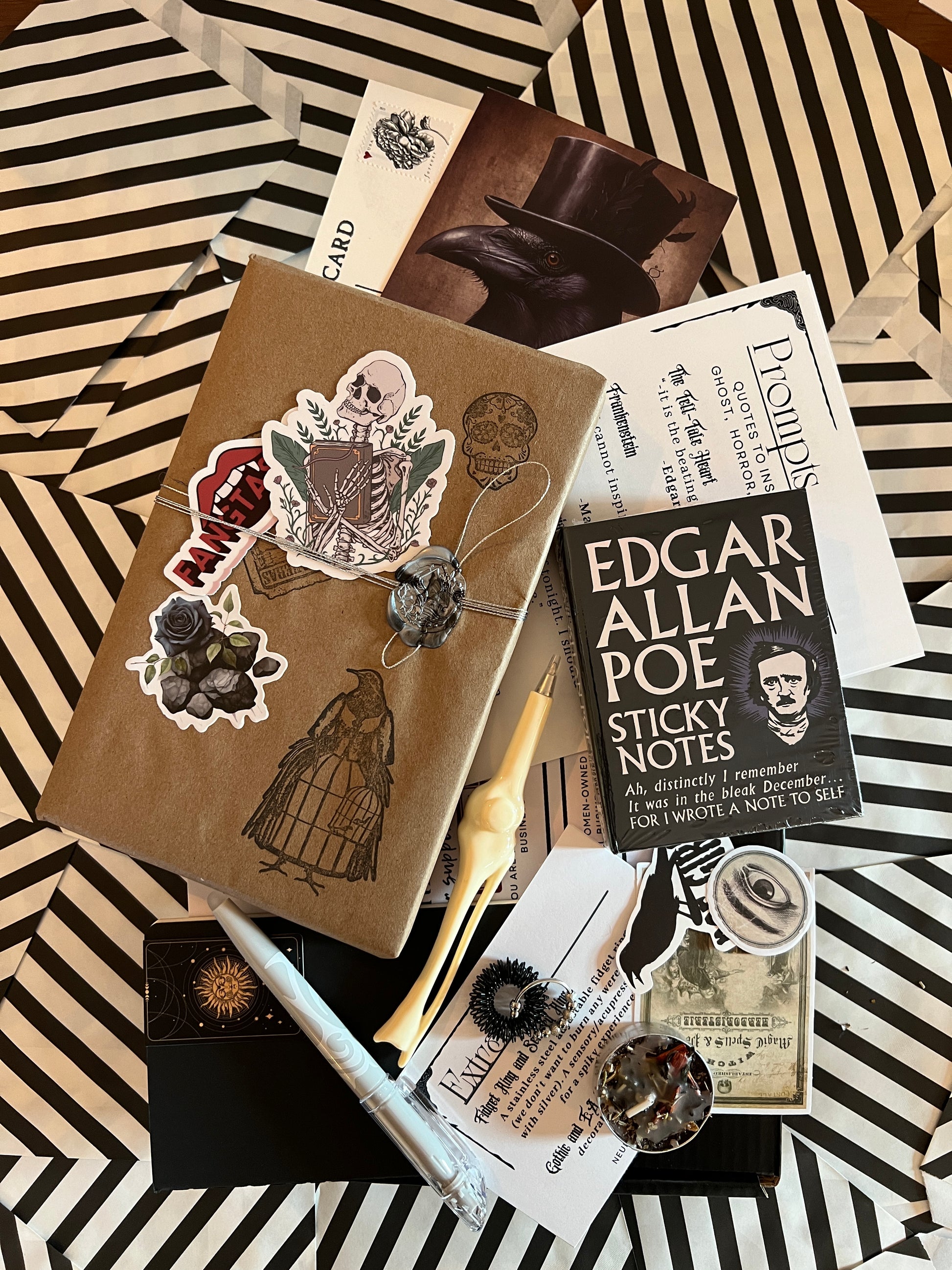 Extras of our Neurospicy Writer's box from October 2024. Our writing box is curated by and for neurodivergent writers or any writer needing extra encouragement or inspiration. Each box contains challenges, notes and gifts to Encourage, Motivate, Inspire and Celebrate your Creativity. This was designed for the season to be slightly macabre and ghostly. (It's also one of our favorites:)