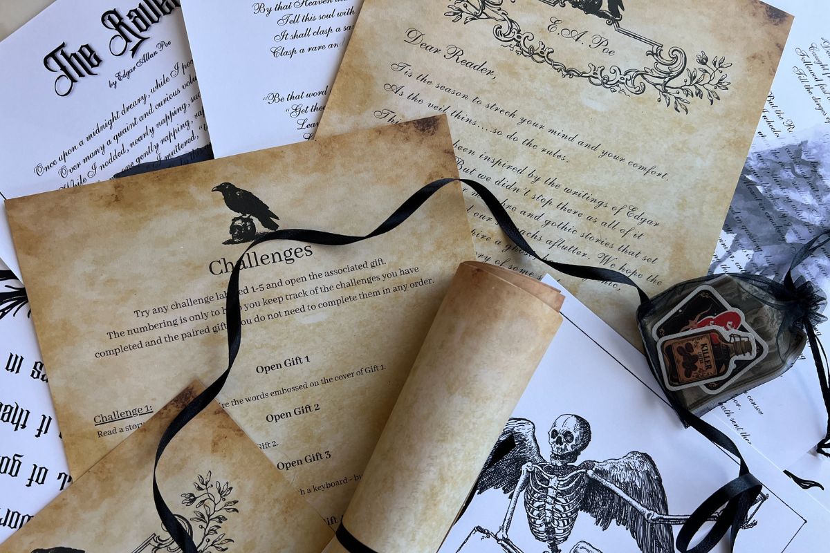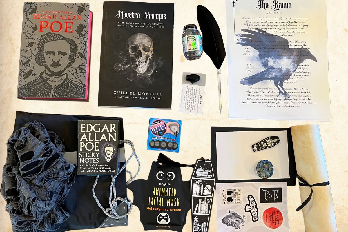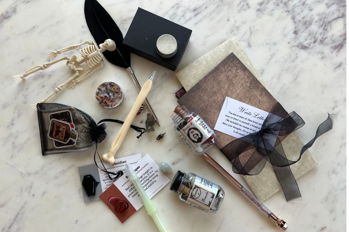 Get ready for the ultimate spooky writing adventure with the Macabre Combo Box! It includes everything from the Dracula and Poe boxes, plus extra surprises—worth over $240! Enjoy three beautifully embossed books with painted edges: Dracula, Edgar Allan Poe, and your choice of Grimm's Fairy Tales, Frankenstein, or The Legend of Sleepy Hollow. Packed with a Macabre Prompt book full of word games, visual prompts, and writing challenges, plus a softback journal, an Onyx or Jasper bracelet, prompt jars, fidgets, and a grab bag of 23 fun gifts like bookmarks, candles, and stickers. Plus, stunning macabre art prints on quality cardstock to keep your creativity flowing!